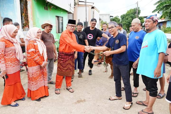 Bantuan kurban sapi secara simbolis diterima langsung oleh Ketua PWI Provinsi Kepri, Andi Gino di Perumahan Taman Anugerah Ideal, Senin (17/06/2024). Penyerahan hewan kurban ini disaksikan perangkat RT/RW dan masyarakat Perumahan Taman Anugerah Ideal.