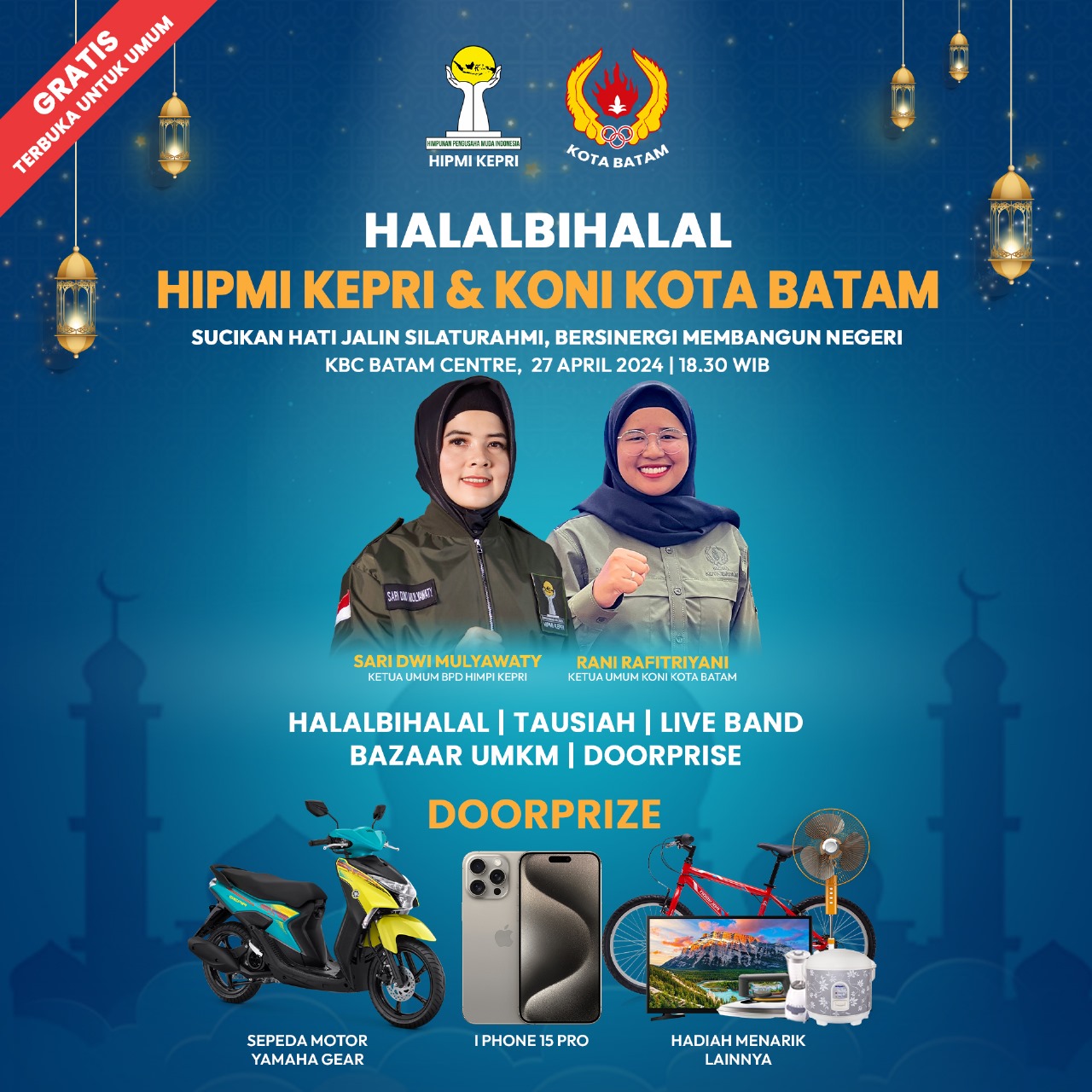 BATAM (Mk.com)_Koni Kota Batam dan HIPMI Kepri berkolaborasi menggelar agenda Halalbihalal dengan tema “Sucikan Hati Jalin Silaturahmi, Bersinergi Membangun Negeri, Sabtu (27/4/2024). Bertempat di KBC Batam Centre, KONI Batam dan HIPMI Kepri juga telah menyiapkan puluhan _doorprize_ menarik untuk para peserta.