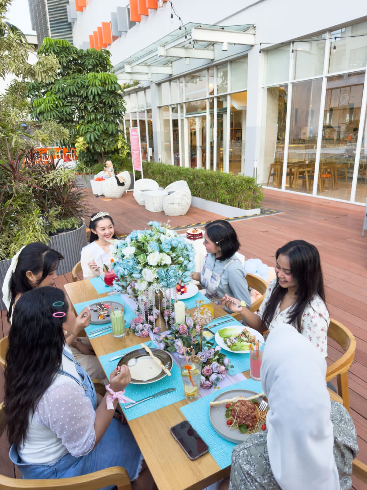 Dalam promosi yang baru diberikan, hotel menampilkan suasana outdoor yang indah di area kolam renang dengan latar belakang taman hijau yang rimbun, cahaya matahari sore yang hangat, serta dekorasi meja makan yang dipenuhi dengan hiasan bunga, balon berwarna pastel, serta detail interior yang menawan.