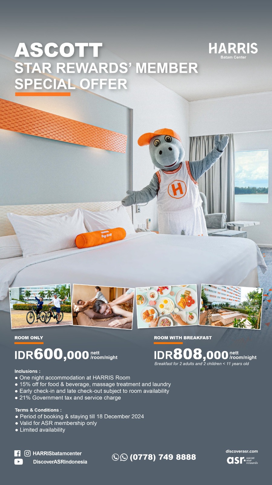 Promo terbatas yang hanya berlaku sampai dengan 18 Desember ini, dapat dibeli jika anda telah menjadi anggota Ascott Star Rewards yang merupakan program loyalty grup Ascott. Untuk menjadi member sangat mudah dan tidak perlu membayar alias gratis, cukup mendaftar di link berikut https://www.discoverasr.com/en/sign-up?referralCode=IDHBCT atau dapat mendaftar langsung ke resepsionis HARRIS Hotel Batam Center.