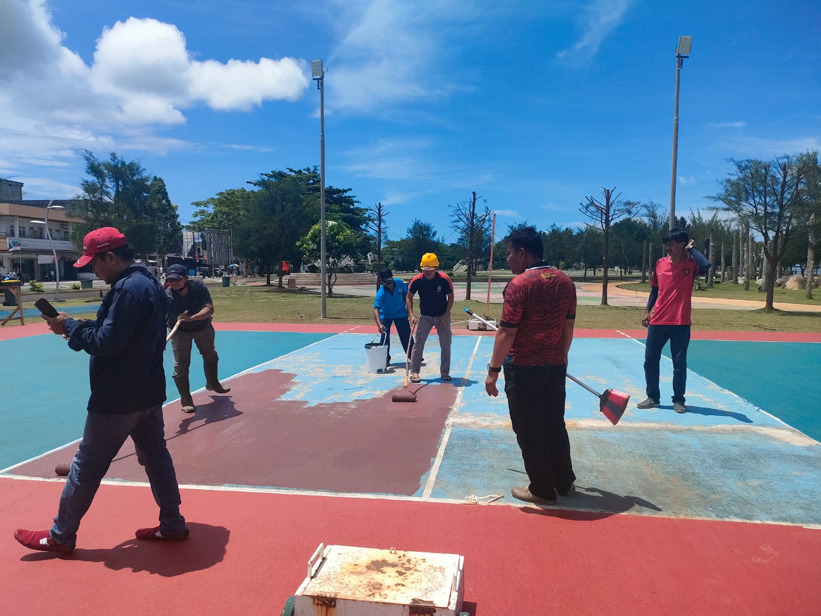 Tampak sejumlah panitia tengah mencat ulang lapangan bola voli di Pantai Piwang.