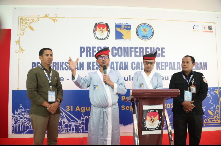 Keduanya menggelar konferensi pers usai menjalani tes kesehatan di RSBP Kota Batam. Cak Nur dan Hardi kompak mengenakan tanjak, penutup kepala khas Melayu.