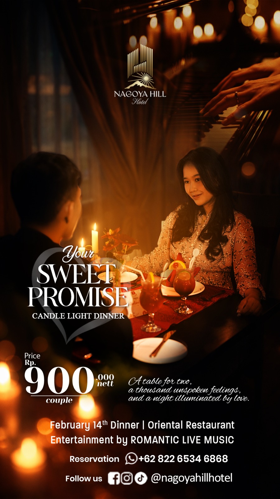 BATAM (Mk.com) _ Dalam rangka merayakan Hari Valentine 2026 yang penuh makna, Nagoya Hill Hotel Batam dengan bangga menghadirkan program romantis bertajuk “Your Sweet Promise – Candle Light Dinner”, yang akan diselenggarakan pada 14 Februari 2026 di Oriental Restaurant.