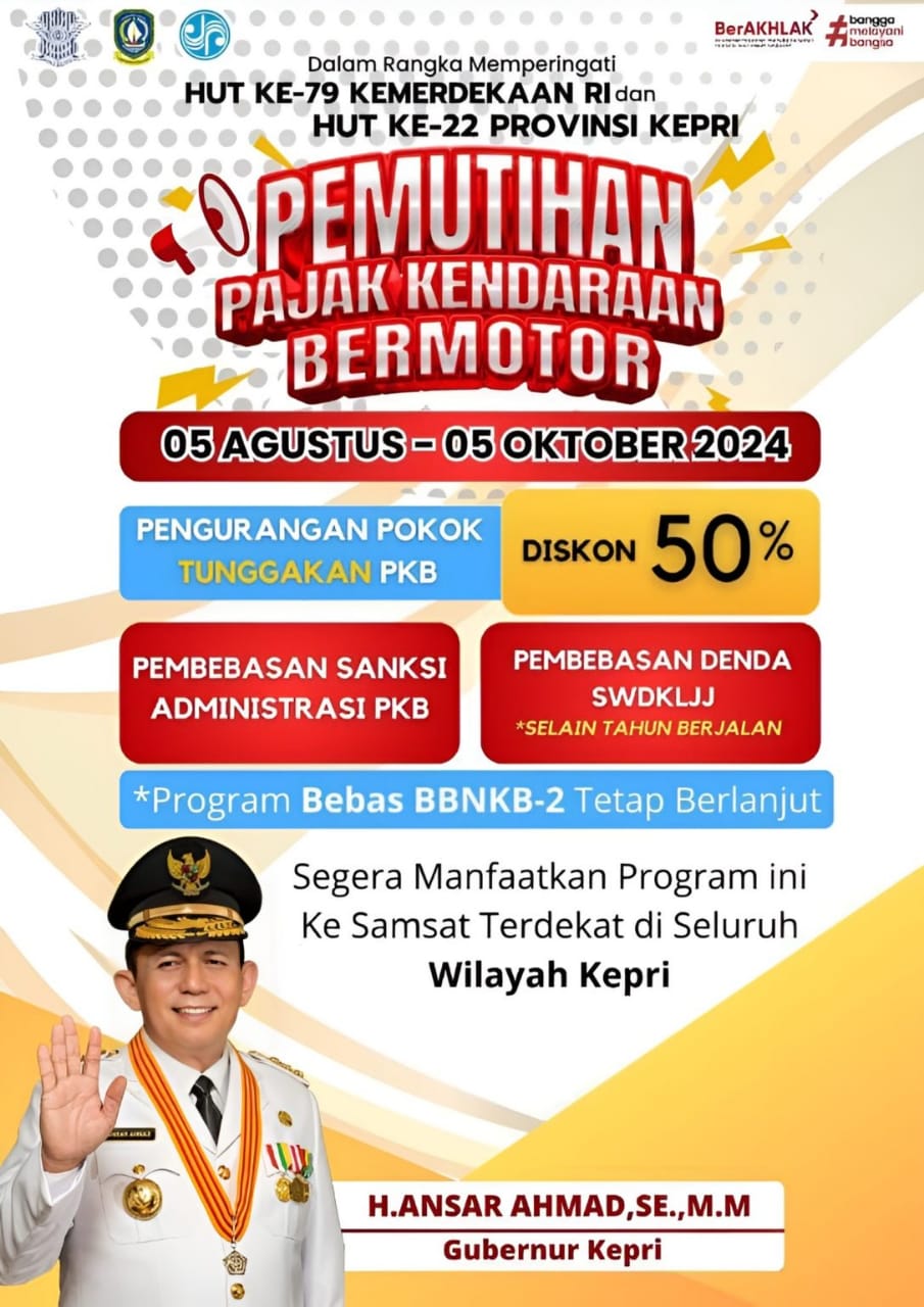TANJUNG PINANG (Mk.com) – Gubernur Kepulauan Riau, H. Ansar Ahmad, telah menyetujui Program Pemutihan Pajak Kendaraan Bermotor (PKB), program yang menjadi kado peringatan HUT Ke-79 Kemerdekaan RI sekaligus HUT Ke-22 Provinsi Kepri.