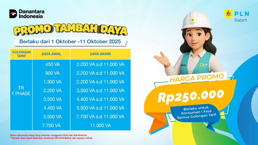 Program ini berlaku mulai tangal 1 sampai 11 Oktober 2025 mendatang, dengan menyasar pelanggan dengan daya awal 450 VA hingga 7.700 VA yang ingin menambah daya hingga maksimal 11.000 VA.