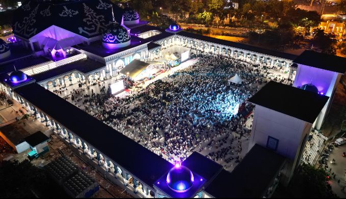 Ribuan jemaah hadir memadati area masjid sejak sore hari dan dengan antusias mengikuti jalannya seremoni kegiatan.