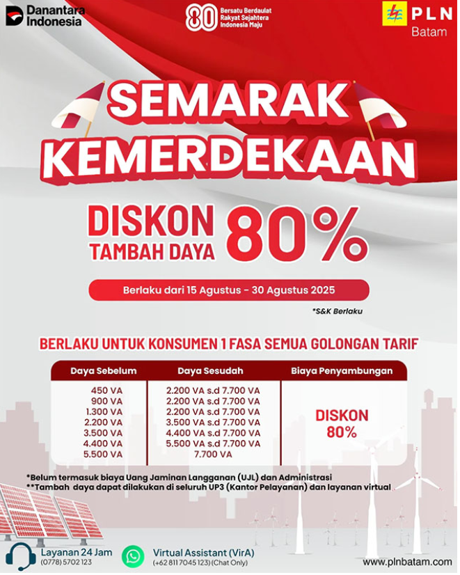Prpgram ini memberikan diskon biaya khusus untuk tambah daya listrik bagi pelanggan hingga 80 persen. Program ini berlaku mulai 15 sampai 30 Agustus 2025. untuk seluruh golongan, mulai dari pelanggan rumah tangga, UMKM, industri kecil, hingga pelanggan sosial.