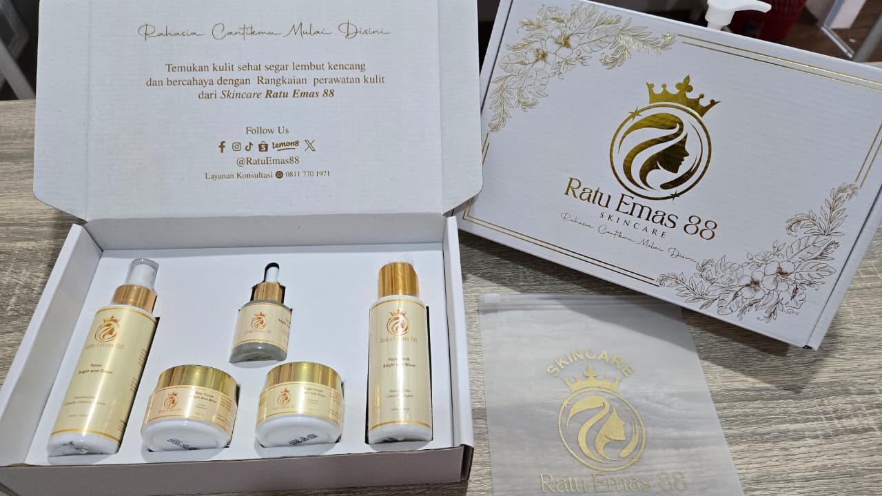 Skincare Ratu Emas88 ini dikemas dalam 1 kemasan dus mewah berwarna putih dengan tinta keemasan terdiri ada 5series :